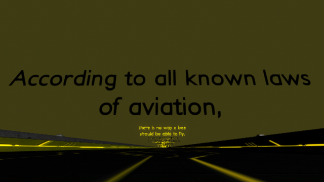 According to all known lawsof aviation there is no way a beeshould be able to fly. Because bees dont care what humans think is impossible Narrarator Bee Movie.